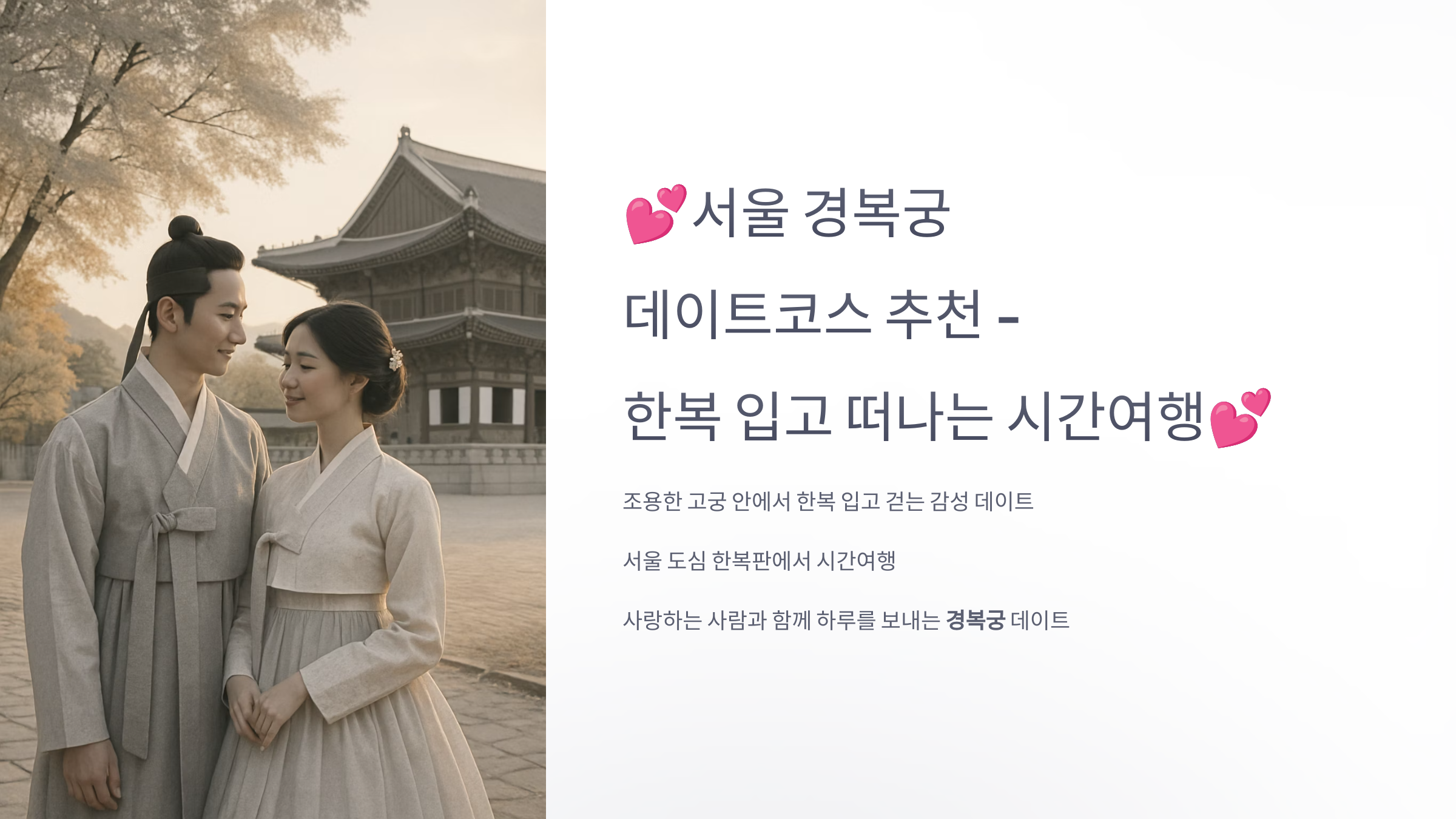 고궁의 멋진 풍경과 함께 인생샷도 남기고, 전통과 현대가 어우러진 독특한 데이트 분위기를 즐겨보세요. 마치 사극 속 주인공이 된 듯한 기분으로 둘만의 추억을 남겨보세요📷✨