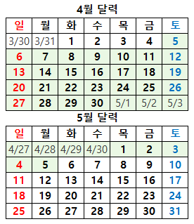 4월 5일 (토) ~ 5월 5일 (월)