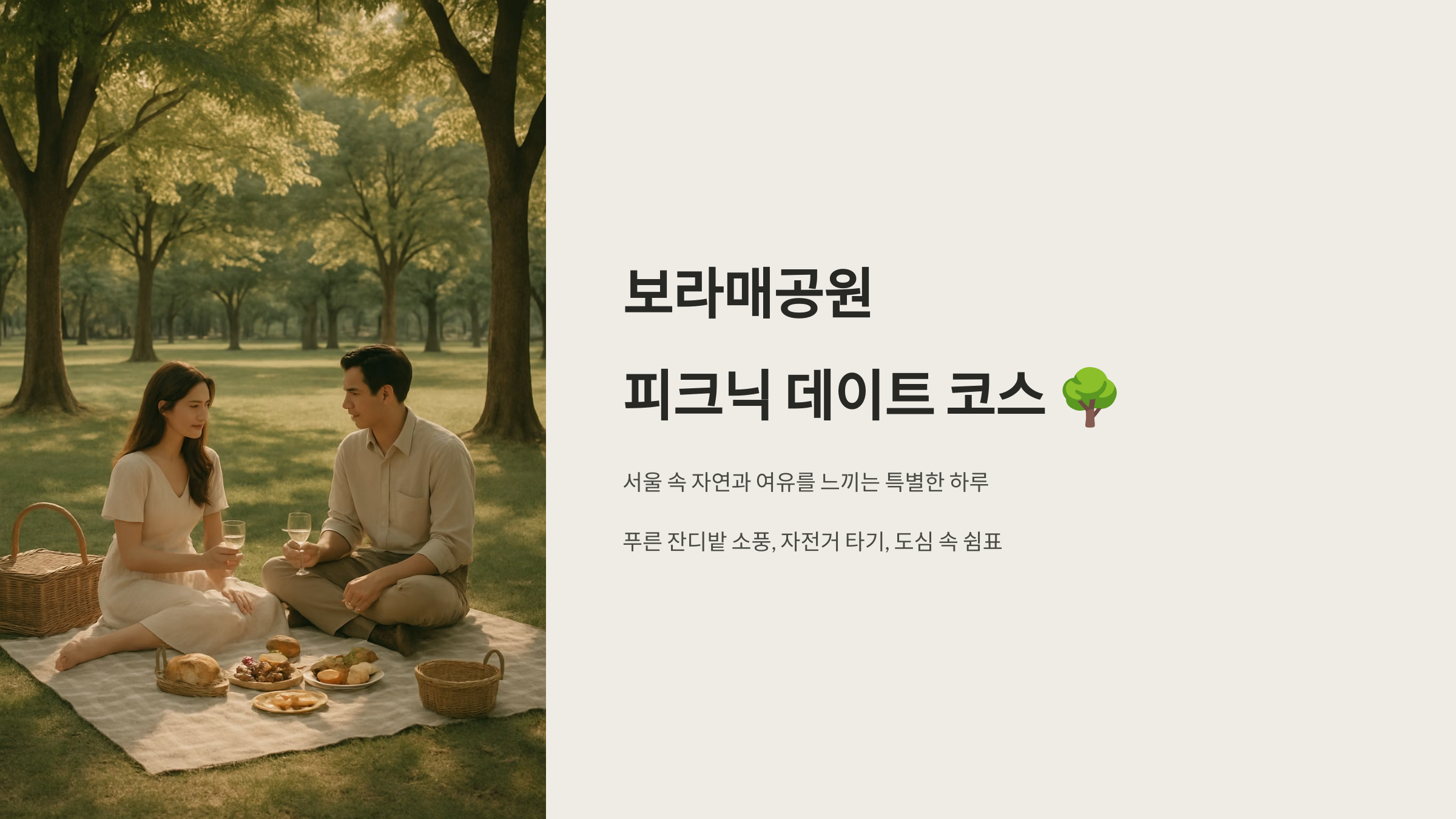 서울 속에서 자연과 여유를 동시에 느끼고 싶다면, 보라매공원에서의 피크닉 데이트를 추천해요! 푸르른 잔디밭에서의 소풍, 자전거 타며 시원한 바람 맞기, 그리고 도심 속에서 잠깐의 쉼표를 찍는 특별한 하루. 오늘은 그런 힐링 데이트를 소개할게요! 🧺🚴♂️