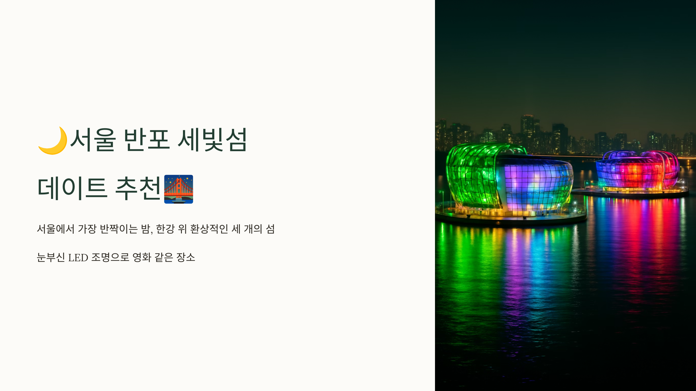 서울에서 가장 반짝이는 밤, 그 중심에는 반포 세빛섬이 있어요. 한강 위에 떠 있는 환상적인 세 개의 섬, 그리고 눈부신 LED 조명… 여기는 그 자체로 영화 같은 장소랍니다.